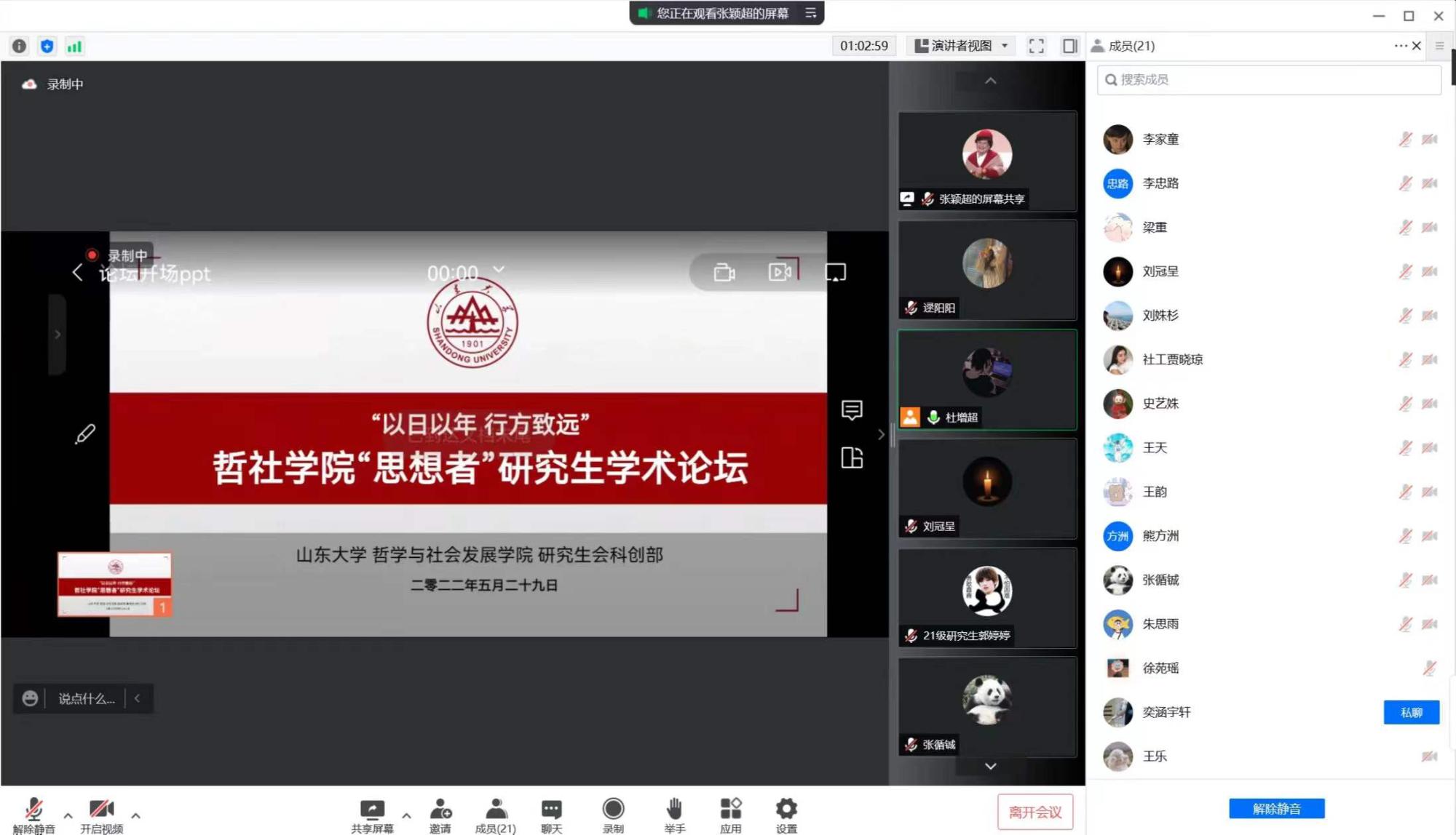 本次论坛入选论文主题涵盖中国哲学、马克思主义哲学、社会学、社会工作、社会保障等专业领域。刘姝杉同学作了以《计划生育特殊家庭“特殊化”与“去特殊化”需求的内在张力与应对策略》为题的报告,给计划生育特殊家庭帮扶服务提出了应对策略;周方晴同学作了题为《从<易传>之“生生”看易道互鉴》的报告,从“生生”这个切入点出发,为易学与道家哲学研究提供了新视野;孔涵同学作了题为《小组工作介入精神照顾者压力舒缓的研究——以“携手共行”园艺治疗小组为例》的报告,阐述了“小组工作”模式对舒缓精神照顾者压力的作用;刘冠呈同学作了题为《合理启蒙与马克思主义宗教观——以恩格斯为核心》的报告,就“宗教”在马克思主义哲学中所扮演的角色给出了自己的理解;梁重作了题为《智残儿童家庭抗逆力提升路径研究》的报告,明晰抗逆力理论并推动其在社会工作实务领域的运用,以促进处境不利儿童与青少年正向成长;张循铖同学作了题为《社区社会组织参与城市社会治理的有效路径探析——以东营市东营区为例》的报告,整理出东营社区社会组织参与与城市社区治理的一些有效路径;贾晓琼同学作了题为《心理社会治疗模式下孤残儿童临终关怀的社会工作服务干预》的报告,寻找为临终孤残儿童营造良好的临终关怀氛围,提升孤残生命质量和自我效能感的方法;李家童同学作了题为《家庭背景如何形塑学生感知的教师支持——学生参与家庭决策的中介作用》的报告,利用文化再生产的理论视阈,使用中介效应分析的方法,发现了家庭社会经济地位对学生感知的教师支持的正向影响以及学生家庭决策参与在其中的中介作用;徐苑瑶同学作了题为《我国研究生教育阶段的推免招生与人才选拔——基于PSCUS数据的实证研究》的报告,对于完善研究生招生多元录取机制、提高研究生招生质量等议题具有重要的政策意义;鉴伟伟同学作了题为《夫妻权力、生活经历和女性的阶层认同》的报告,基于结构主义和建构主义两个视角,重点探讨了收入和生活经历如何塑造了女性的阶层认同。