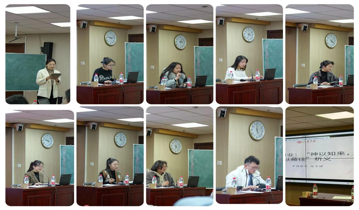 本次论坛共有十篇论文入选,论文内容涉及哲学研究、社会学研究等多个方向。赵晨旭进行了题为《工作自主性、工作压力与青壮年的工作满意度》的报告,她利用CGSS2021探讨青壮年的工作满意度与工作自主性、工作压力的关系。郭文雯从空间社会学的视角出发,提出透明性是一种显著的现代化空间现象,而透明性与空间的结合则象征着一种空间权力关系的新形式。徐子珺则对《系辞》“神以知来,知以藏往”一句话进行了深入解析,以《筮占与徳占:“神以知来,知之藏往”析义》为题进行了报告。王康蘅以《由双遣到双照—成玄英出入圆融思想的内在理路》为题进行报告,将出世道果与入世功德在道德本体上打通为一体两面。刘晓彤以《“修心向道”:司马承祯<坐忘论>之工夫论》为题,主要研究了司马承祯修行工夫上的“身心兼修”之论。毕文琦的报告题目是《尼克·斯尔尼塞克的平台资本主义批判与反思》,论文对尼克·斯尔尼塞克的平台资本主义进行批判与反思。熊梓涵以《“织”造女性:马克思主义女性主义观照下的男耕女织》为题,从马克思主义女性主义角度审视“男耕女织”,揭示这一生产形式在历史性别关系中的工具作用。吕奕涵以《融入与排斥:信息化背景下残疾人的就业排斥问题研究》为题,探究信息化背景下残疾人在就业过程中所经历的社会支持与社会排斥现状并分析了促进残疾人信息化就业的内生机制。房新茹在题为《参与式发展视角下的社会工作介入流动儿童社会融入与融合的实践探讨》的论文中,对参与式发展视角下的流动儿童社区融入与融合服务进行探讨,提出通过主体参与、内外互动和双向融合的介入策略,逐步实现流动儿童与生活场域的双向融合。毕烨从费孝通上世纪30年代佚稿入手,展现了费孝通研读韦伯后所提炼的“生活系统”概念如何为中国现代化的可能奠定理性基础,作了题为《在韦伯与托尼之间:费孝通的经济伦理思想研究》的报告。与会老师进行细致点评,同学们表示受益匪浅,会场气氛活跃。闭幕式中,与会老师及同学们进行合影留念,本次“思想者”工作坊的举办取得圆满成功。