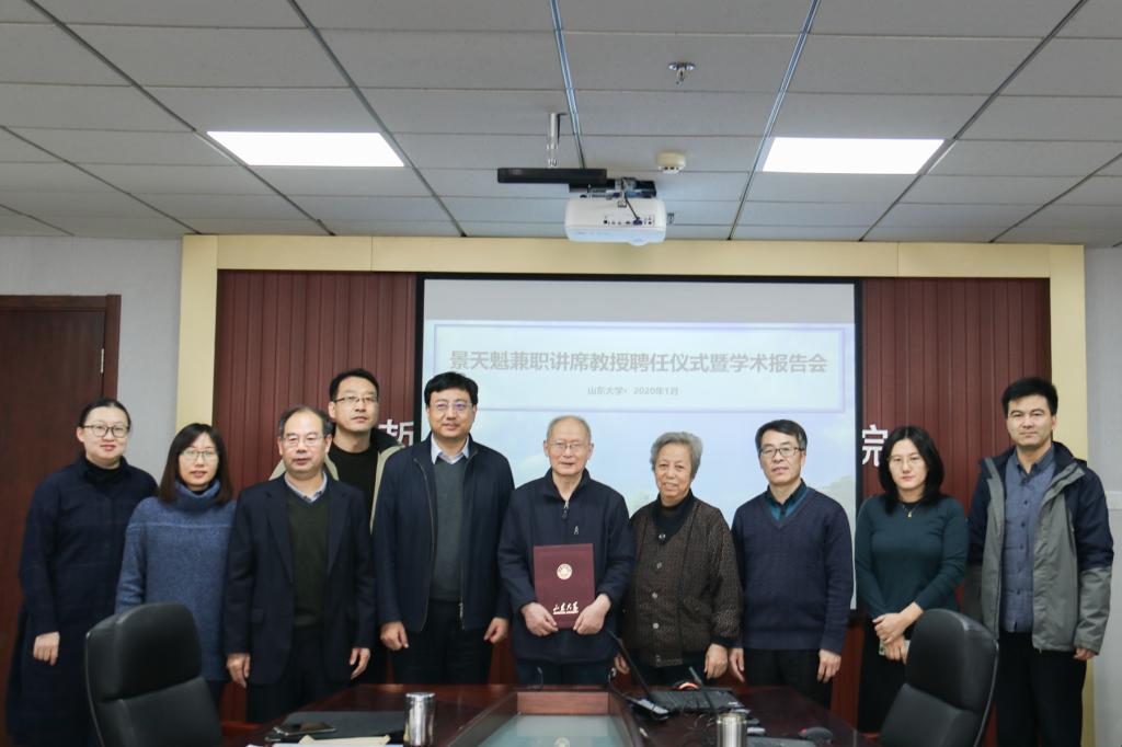 邢占军为景天魁老师颁发聘任证书并致辞。他对景老师的到来表示热烈欢迎,感谢景老师对山大社会学的支持,并期望在景老师的指导下社会学学科做的更强。未来要以山大学派建设和学术影响力的扩大作为双一流学科建设新的增长点,实现双一流大学建设目标。