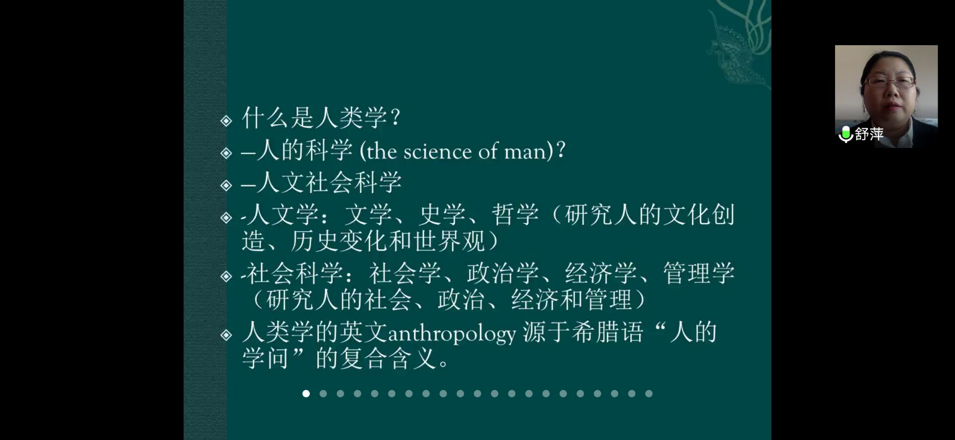 首先,舒萍向同学们介绍了人类学的分类,提出“人类学主要研究的是文化”的观点,并通过分享自己的田野观察成果来向同学们介绍了“文化”,并强调了文化的整体性、多样性等特征。舒萍还以吃饭的工具不同为例讲述了人类学中的跨文化比较,阐述了在人类学中要用平等的视角在不同的文化中进行事物的分析。