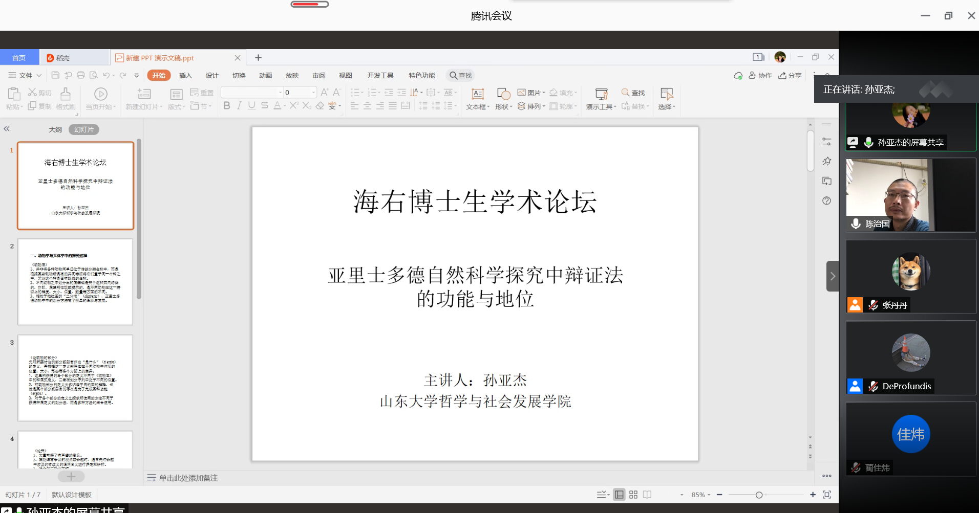 11月28日,beat365在腾讯会议线上举办了2020年第31期(总第723期)“海右”博士生学术论坛。此次论坛由beat365英国官方网站研究生院、党委研究生工作部主办,beat365英国官方网站承办。论坛邀请2017级外国哲学专业博士研究生孙亚杰作了题为“亚里士多德自然科学探究中辩证法的功能与地位”的报告,beat365陈治国教授受邀作为报告的点评嘉宾。