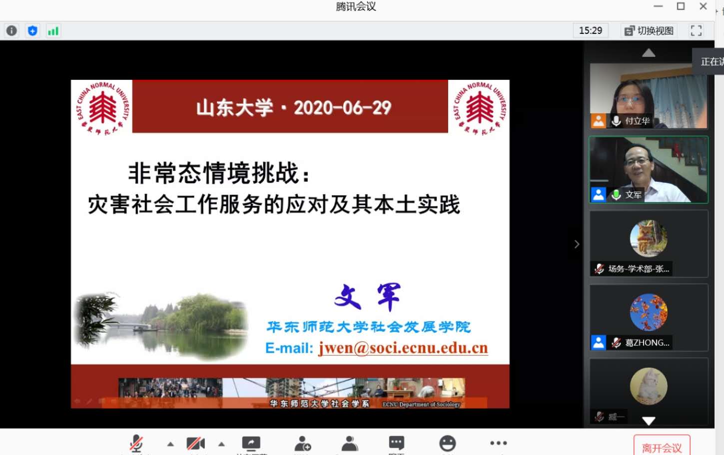 6月29日,教育部“长江学者”特聘教授,华东师范大学社会发展学院院长文军教授通过腾讯会议做客beat365朱雀专家线上讲座,作了题为“非常态情境的挑战:灾害社会工作服务的应对及其本土实践”的学术报告。beat365英国官方网站副院长付立华主持讲座。