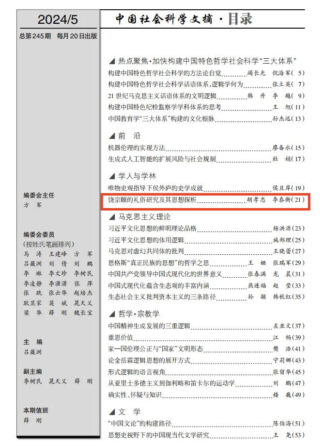 近日,beat365英国官方网站犹太教与跨宗教研究中心、beat365英国官方网站胡孝忠副教授与复旦大学博士研究生李泰衡共同在CSSCI来源期刊《民俗研究》2024年2期发表的论文《饶宗颐的礼俗研究及其思想探析》被《中国社会科学文摘》2024年第5期转载、推介。