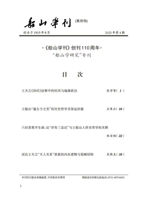 《船山学刊》创刊于1915年,由湖南省社会科学界联合会主管、主办,是我国现存办刊时间最久的思想文化学术期刊。该刊以船山思想研究为核心,以倡扬湖湘文化为主旨,同时兼容儒、佛、道及中国传统学术文化研究。现为船山学及湖湘文化研究领域中最有权威的刊物,被确定为中国人文社会科学核心期刊等多种检索对象,2007年至今为中文社会科学索引(CSSCI)扩展版来源期刊。
