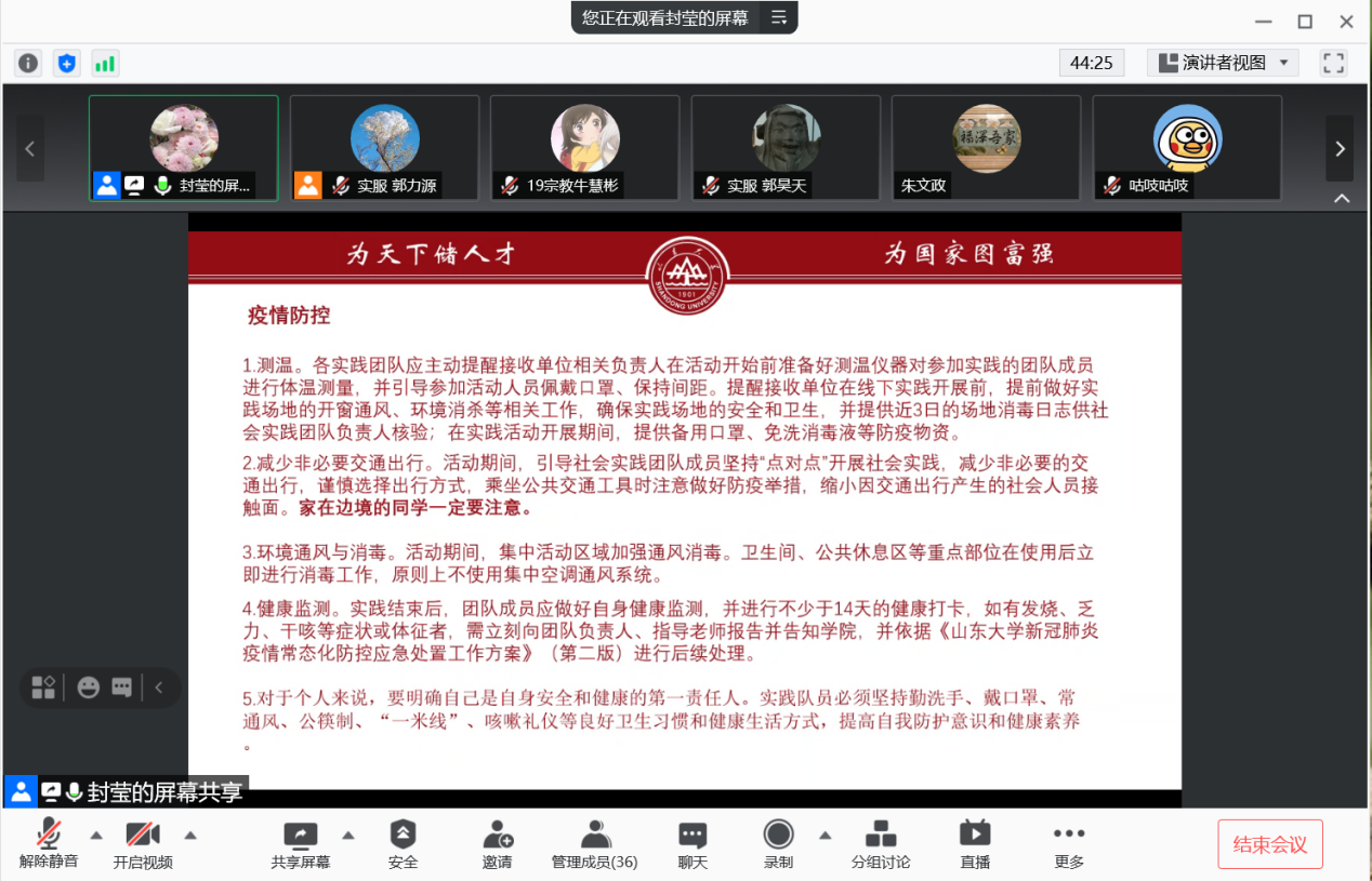 本次会议旨在统筹部署暑期学生社会实践的安全工作。首先,封莹指出,在建党百年、立校百廿和疫情防控常态化的背景下,参与社会实践的全体同学必须高度重视安全工作,进一步树立“自己是安全和健康的第一责任人”的意识。接着,封莹从疫情防控,政治安全和意识形态安全,信息与财产安全,食宿安全与着装,出行安全,安全汇报等六方面系统介绍了社会实践的安全要求。封莹针对实践活动中可能出现的意外状况作出了说明,并给出解决意见,同时要求实践团队开展队员身体健康和财物安全情况日报工作,定期向学院社会实践安全负责人汇报情况。最后,封莹强调,保证安全是暑期实践活动中的头等大事,各位参与实践活动的同学要牢固树立“安全第一”的意识,严格遵守学院学校和实践地安全工作要求,确保社会实践队伍每位队员的安全。宣讲结束后,各社会实践队前往学院办公室领取口罩等防疫物资,用于社会实践期间队员防疫工作。