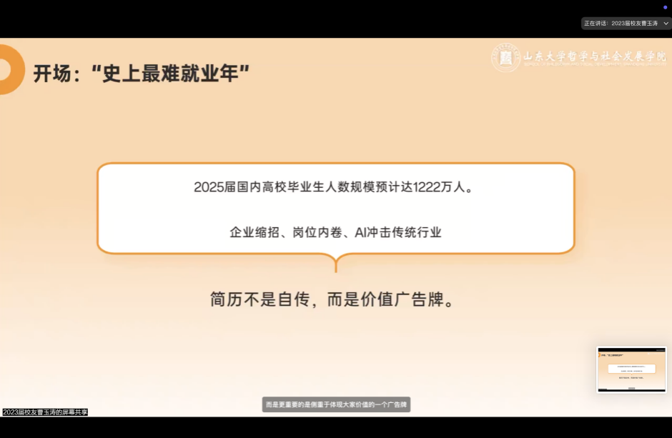 为帮助同学们充分展现个人优势、提升求职竞争力,打造以赛促学、以赛促练大学生就业服务指导新模式, 2月27日,beat365英国官方网站研究生会在“勇往‘职’前”第三届简历设计大赛的基础上组织简历设计指导经验分享会,邀请学校优秀校友、济南城建集团有限公司人力资源管理部曹玉涛、廉雪进行指导与分享。辅导员吕汶鑫老师主持活动,学院百余名同学参与。