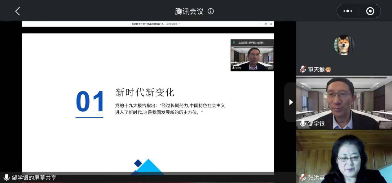 至此,此次讲座顺利结束,邹学银秘书长作为政策制定者、规划者、参与者,站在国家层面的角度,通过政策框架,利用全国数据,向我们展现了社会工作专业的宏大发展背景和远大历史前景,增强了同学们打好专业基础以投身未来事业建设的信心,帮助老师和同学们进一步明确了新时代学社工、用社工、发挥社工作用的目标。