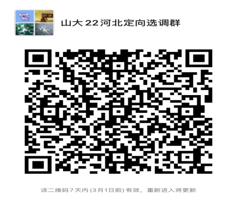 另外,请报名的同学扫码入群,二维码失效后可通过电子邮箱“sdjcgggl@163.com”联系工作人员,备注“姓名-学院-河北定向选调”及时入群。