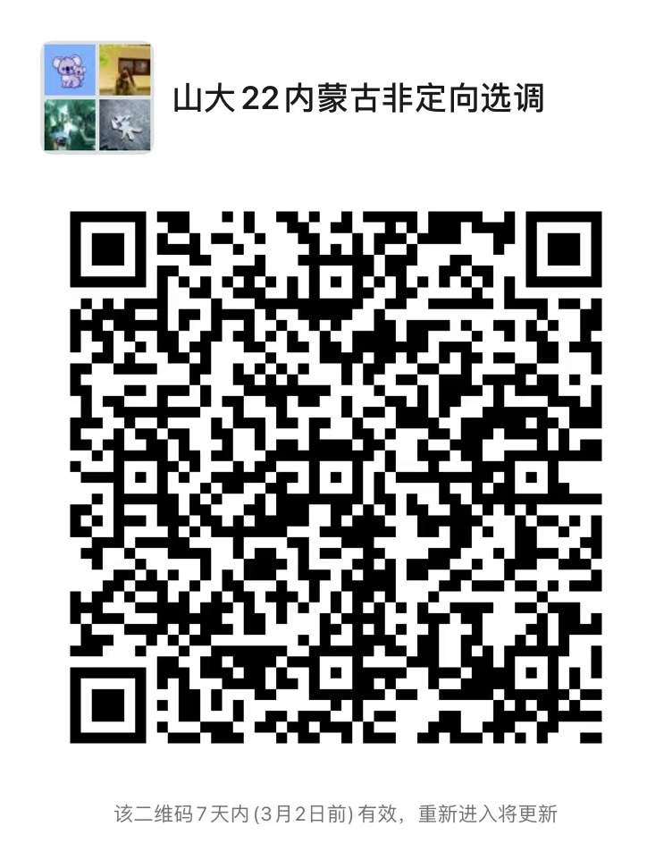 另外,请报名的同学扫码入群,二维码失效后可通过电子邮箱“sdjcgggl@163.com”联系工作人员,备注“姓名-学院-内蒙古非定向选调”及时入群。