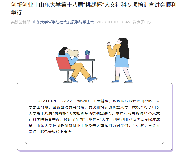 为提升学生创新创业能力,聚焦“五育”融合创新创业教育实践,激发青年学生创新创造热情,帮助学生更好开展和参与 “互联网+”大学生创新创业大赛、“挑战杯”大学生课外学术科技作品竞赛、学生暑期社会实践等适合文科专业的创新创业赛事及活动。通过多种形式开展培训会和经典案例分享会,不断提升学生思想教育的时代塑造力、感召力和引领力。