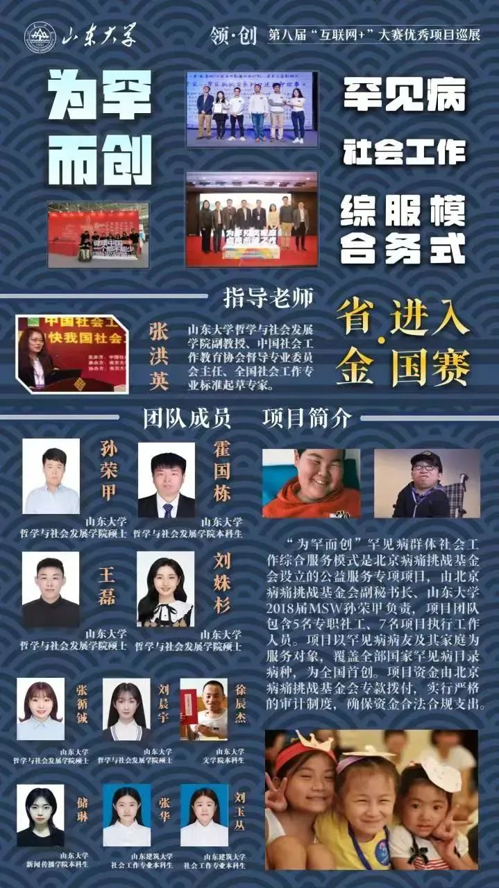 beat365英国官方网站“为罕而创”罕见病服务实践项目团队由学院社会工作系副教授张洪英、社会工作系校友孙荣甲、社会保障专业硕士研究生刘姝杉、社会工作专业硕士研究生刘晨宇、张循铖等人组成。在“互联网+大学生创新创业大赛”中团队成员们提出了覆盖罕见病群体综合服务的“两个中心、一个平台”模式,获得第八届中国国际“互联网+”大学生创新创业大赛省赛金奖与国赛铜奖的荣誉。