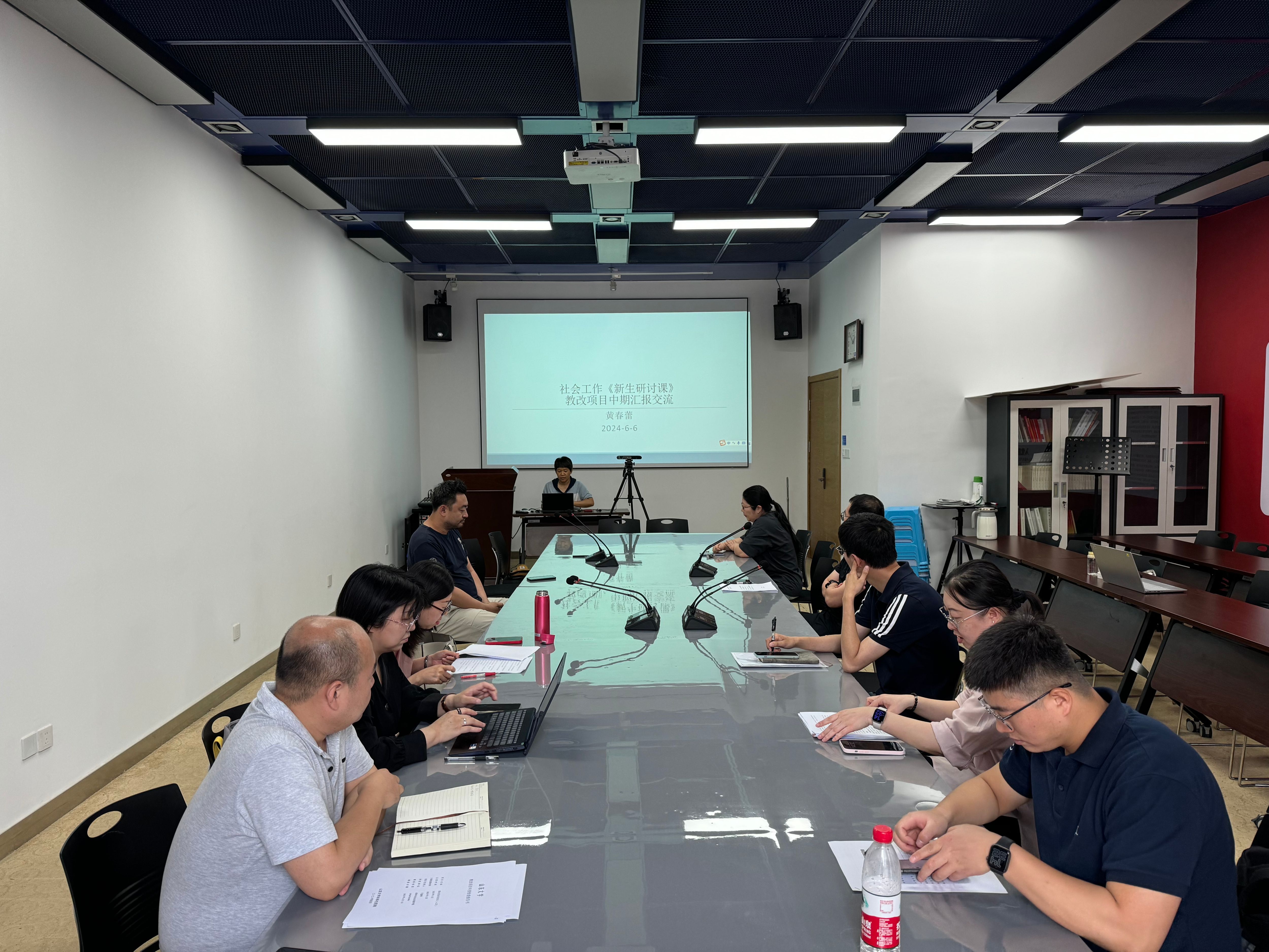 会上,黄春蕾老师就《社会工作专业<新生研讨课>》项目对新生研讨课的教学模块与教学形式进行了详细介绍,并结合实际教学实例做了感悟分享。舒萍老师针对《跨学科理论课程的实践救学模式研究》项目,对项目中田野调查环节展开了详细报告,并从调研的全过程对研究实践的突破做了分享交流。董春老师就《<周易>与中华优秀传统文化》项目,根据当前的阶段性成果,对周易在当代的创造性转化和创新性发展进行了介绍,并对项目未来开展计划进行了介绍。于志强老师对《<个案工作>体验式教学与社会工作实验室平台化建设》项目进行了介绍,报告了教学改革的实施过程中的创新性尝试。李海涛老师对《专业创新教育实践与五育并举融合模式探索研究》项目进行了介绍,阐述了项目依托《专业创新教育实践》课程从五育并举角度促进课程发展与当代教学理念相结合的具体方式,并对项目开展以来取得的进展进行了汇报总结。李淼老师就《基于OBE理念的社会学理论课程思政研究》项目,对社会学相关课程设计的思路和模式进行了介绍,结合习近平新时代中国特色社会主义思想对如何对传统课程进行优化与改良做了汇报。杨小平老师针对《佛教哲学与生命智慧(国学)》项目,对课程考核方式中量化指标的规定方面提出了自己的创新性想法,强调了激发学生对国学通识课程兴趣的举措的重要性。梁栋老师就《意义与活力“双提升”:“课程思政”与研讨型教学的融合与应用探索》项目,对课程思政方面项目已经实施和计划实施的举措进行了介绍,结合高等教育发展趋势,就研讨课的课程形式的发展进行了分析与发展期望。胡源源老师针对《“实践型“通识教育课程模式——以<社会调查方法>为例》项目,强调了对于学生主体性的发挥方面的项目举措进行了介绍,并对项目施行过程中遇到的问题进行了分析,结合教学案例阐述了对这些问题进行的针对性改善的举措。王强伟老师就《犹太历史与文化(人文)》通识课程的课堂讲授方式与与会老师进行了经验交流,并对项目下一阶段的计划进行了介绍。吴童立老师就《青少年哲学》项目,对教学法课堂实践的具体举措和当前的开展情况进行了介绍,并对项目发展遇到的瓶颈和预计解决方案进行了汇报。苏冰涛老师针对《“教学学术”与“课程思政”理念对师生双向价值观的建构分析》项目,提出应当重视以学生为主体及激发学生创造力的在课堂教学中的重要性,并结合了具体案例对教师的教学能力的提升的具体举措提出了独到见解。
