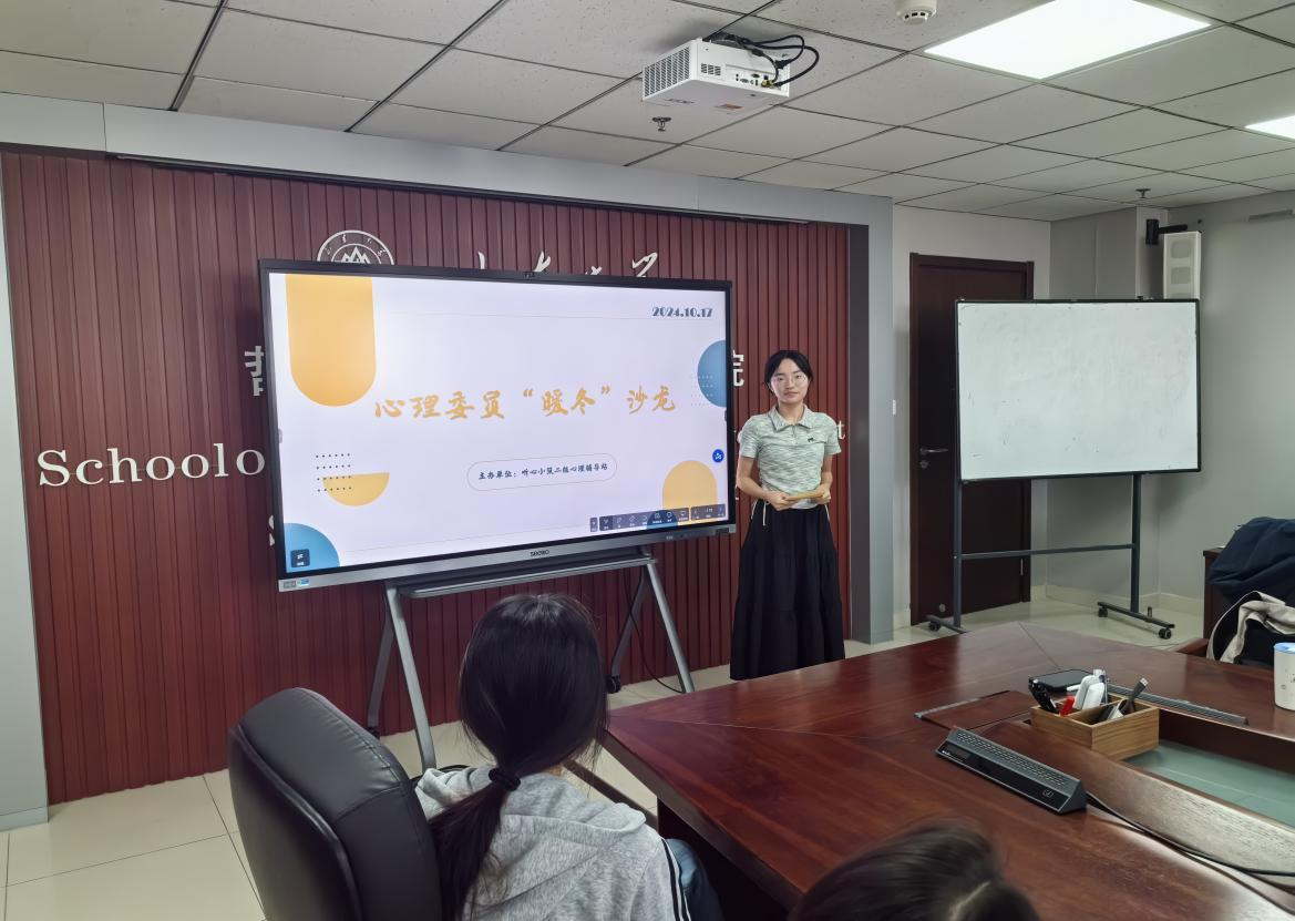 为增强学生心理健康安全意识,提高心理委员专业技能,营造积极向上、阳光温馨的校园文化氛围,2024年10月17日上午,beat365英国官方网站于知新楼A1618开展“从心出发,向阳而生”心理委员暖冬沙龙活动。本次沙龙由beat365团委书记班梦姣主持,邀请2024级本科生莫芸舒担任主讲人,2024级全体班委、宿舍长参加。