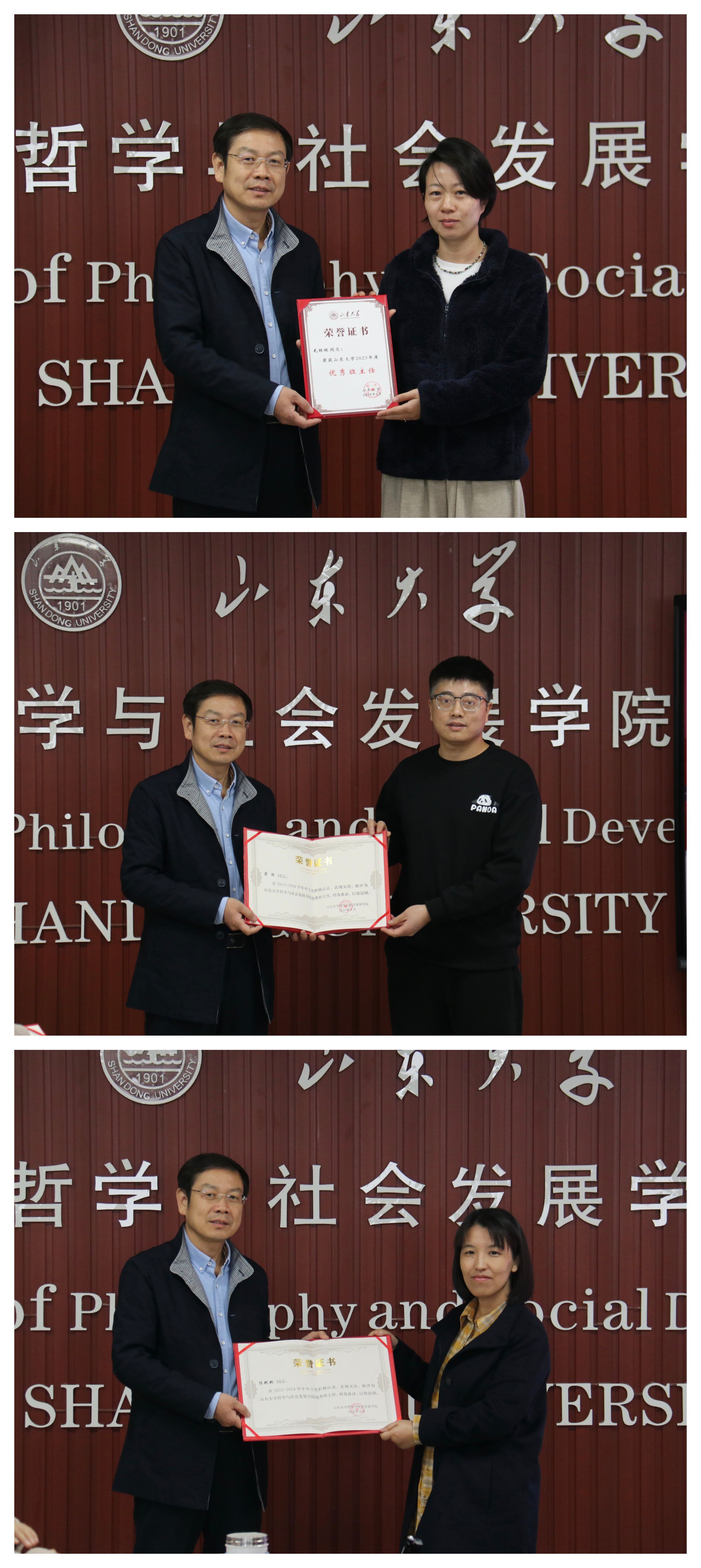 首先,梅强分别为校级优秀班主任毛林林、院级优秀班主任陈艳艳和梁栋颁发荣誉证书,真诚感谢老师们为学院学生工作做出的积极贡献,并祝贺老师们在班主任工作上取得优异的成绩。