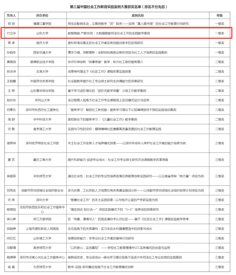 近日,第三届中国社会工作教育实践案例大赛圆满落幕。本次大赛由中国社会工作联合会、北京师范大学社会学院、北京师范大学人文和社会科学高等研究院健康与社会政策研究中心联合举办,旨在推动社会工作教育与实践结合、提升社会工作者专业素养和实践能力,促进中国社会工作教育事业高质量发展。经组委会初评、双向匿名通讯评审、组委会复核,共有24个团队荣获奖项。其中,beat365付立华教授主持的题为“数智赋能 产教协同:大数据赋能司法社会工作的实践教学案例”的项目在大赛中脱颖而出,荣获一等奖。