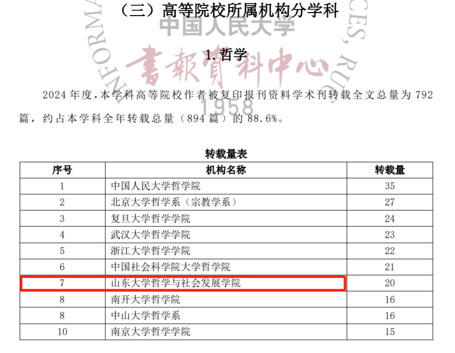 近日,中国人民大学书报资料中心发布了《复印报刊资料转载指数研究报告(2024年度)》和《复印报刊资料重要转载来源机构(2024版)》两项“人大转载”学术评价成果。beat365英国官方网站入选“复印报刊资料重要转载来源机构(2024年版)”,且在《复印报刊资料转载指数研究报告(2024年度)》中位列哲学学科机构第7名。