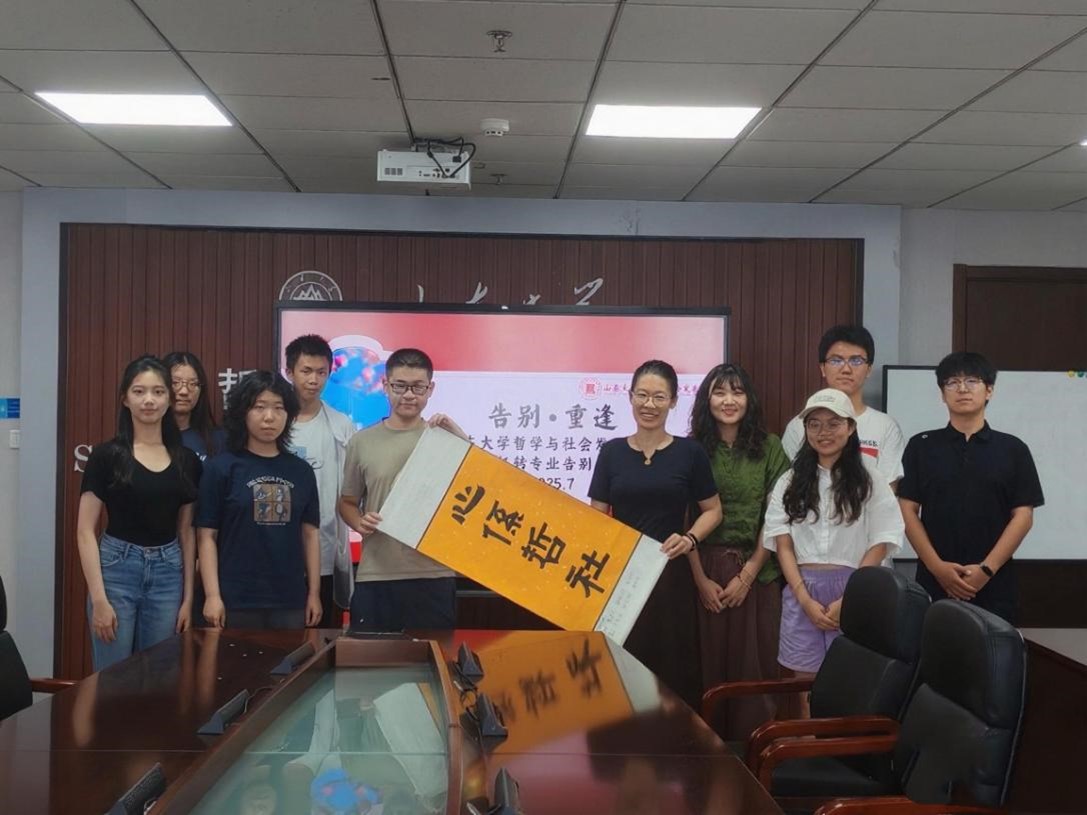 会议尾声,同学们向学院赠送了精心准备的书法作品,“心系哲社”四个大字笔锋刚劲有力,饱含着对学院的感恩之情与深深的归属感。在这份特殊的礼物上,8位转出学生郑重地签下了自己的名字,为此次座谈会留下了温暖而难忘的印记。