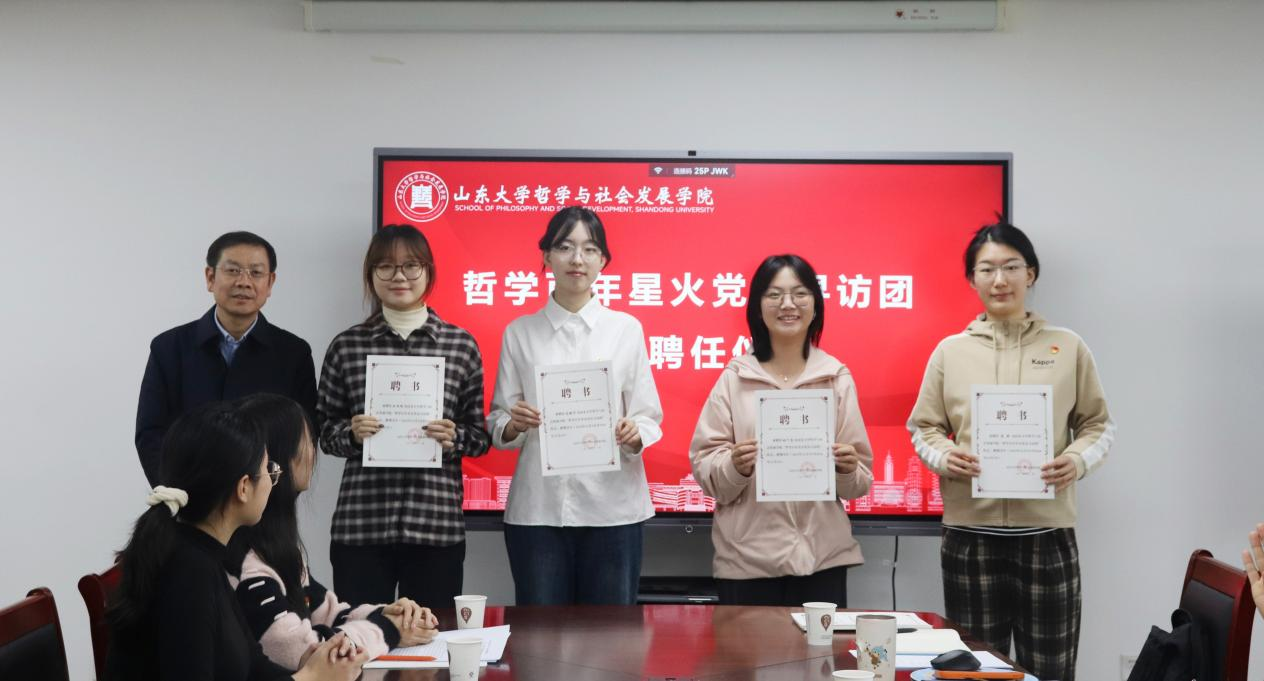 随后,学院党委书记梅强为“哲学百年星火”党员寻访团队长颁发聘任证书。他勉励寻访团成员以此次聘任为契机,切实发挥党员先锋模范作用,深入挖掘学校哲学社会科学历史传统,在实践中锤炼党性修养,传承山大基因,增长才干本领,光大学术文脉。