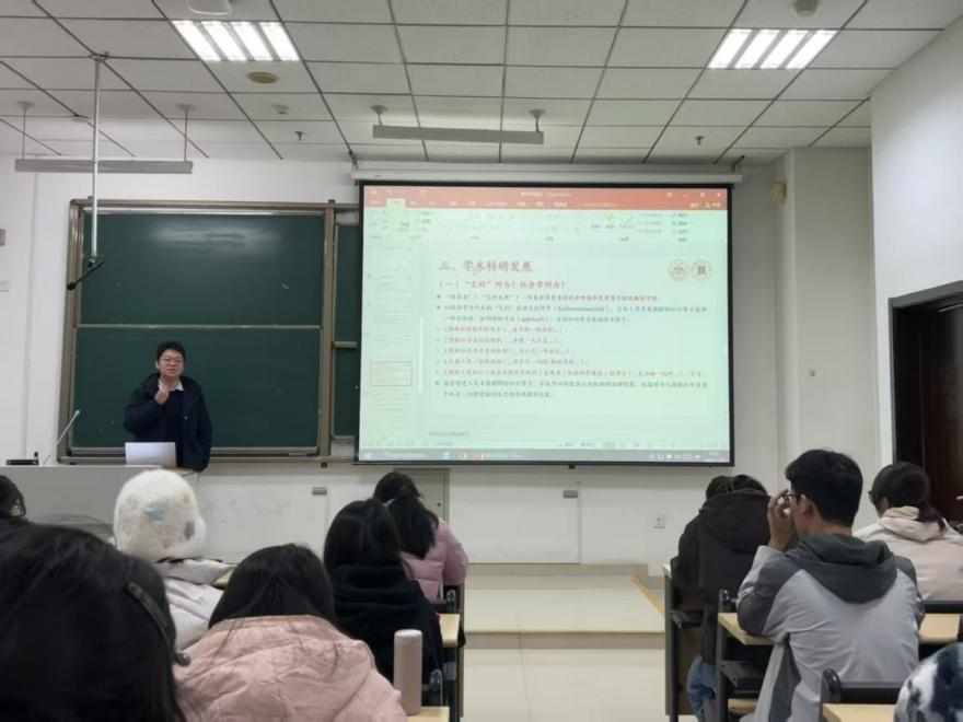 在生涯规划指导部分,周子龙巧用“竹竿效应”比喻,结合自身成长经历,引导新生从盲目“努力”转向精准“用心”,鼓励大家拒绝“躺平”心态,通过多元化尝试探索内心热爱,实现全面发展。针对文科专业学习与学术科研,他围绕“‘文科’何为?社会学何为?”展开深入分享,强调要夯实专业课知识基础,以专业框架为依托挖掘兴趣方向,通过“板块分工+小组分享”的研讨模式深化原著理解性阅读,为新生提供了兼具针对性与可操作性的学习指引。