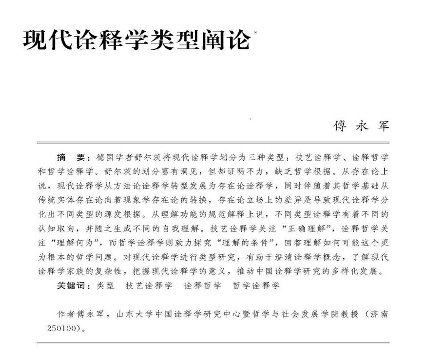 文章最后指出,完全清楚而彻底地区分开三种不同类型的诠释学,特别是将某位哲学家的诠释学直接归于某一类,基本上是不可能的,也没有必要,因为有些诠释学同时具有两种、甚至三种形态。但诠释学混合形态的存在,并不能否定对诠释学进行类型区分的价值和意义。对现代诠释学进行类型研究,实际上属于一种来自诠释学内部的自我批判工作。通过对现代诠释学进行类型研究,我们了解现代诠释学家族系谱的复杂性,了解现代诠释学关于理解本身的多元态度,以及现代诠释学向着多重维度发展的可能性及必然性。我们将坦然接受这个事实,即必须以分化的眼光看待现代诠释学。唯有清楚地了解现代诠释学的类型分化,掌握判分不同类型诠释学的依据与标准,我们才能真正理解现代诠释学,才能够在正确意义上谈论、使用每一种类型的现代诠释学,在充分把握现代诠释学意义基础上,推动现代诠释学不断超越自身,向前发展。