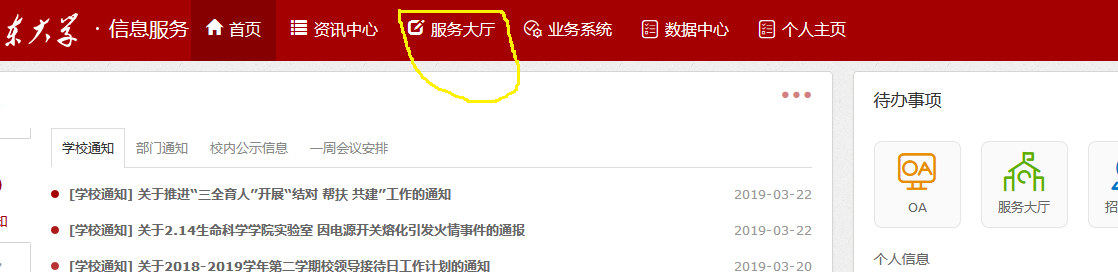 二、登录信息服务系统(教工、学生均可登录),点击“服务大厅”