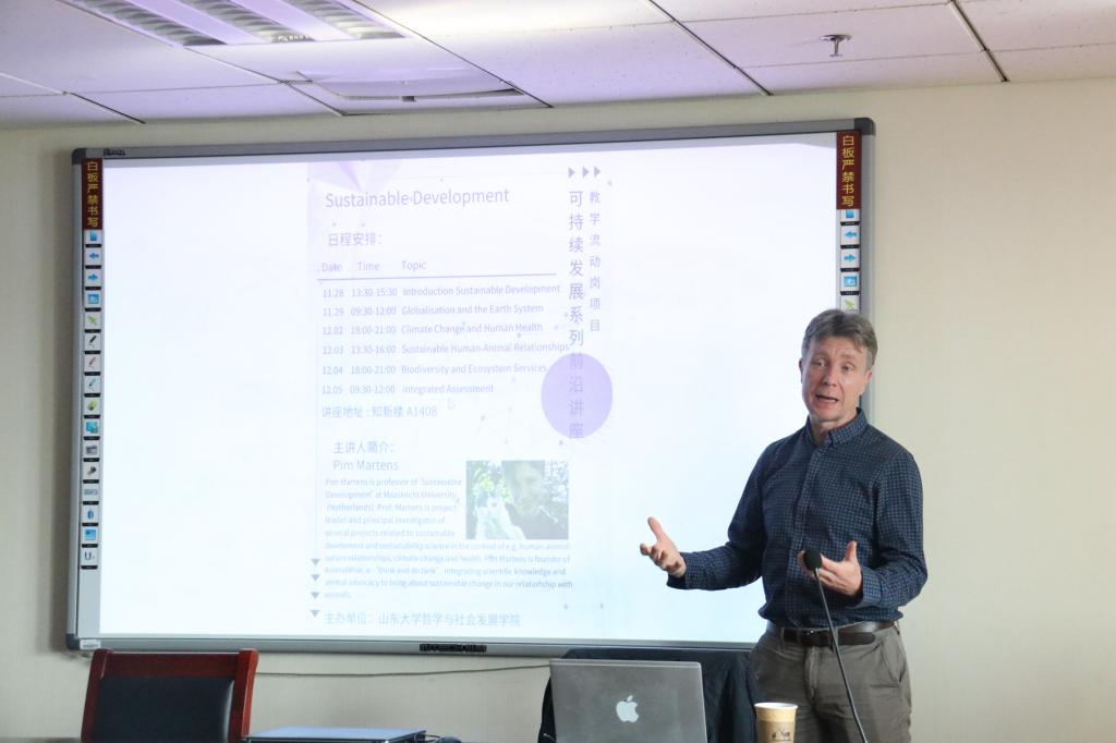 11月28日-12月5日,荷兰马斯特里赫特大学Pim Martens 教授做客beat365可持续发展系列前沿讲座,先后作了“可持续发展导入、人与动物关系、气候变化与人类健康、生物多样性与生态系统”等多个主题的报告,社会学系苏冰涛老师主持。