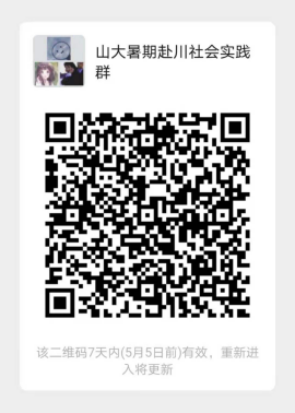 请有意向到四川党政机关社会实践的同学,于2021年5月6日17:00前,将《beat365英国官方网站学生赴四川党政机关社会实践推荐表》(附件1)经学院相关负责人(研究生同学需经导师同意)签字(可电子签)后扫描或者拍照(JPEG图像),连同个人详细简历(PDF格式)与学院报名人员汇总表《beat365英国官方网站赴川开展暑期社会实践学生汇总信息表》(附件2)发送至邮箱sduzheshe@126.com,邮件主题:年级+姓名+四川社会实践。请报名同学扫码加群,具体事宜待学校另行通知。