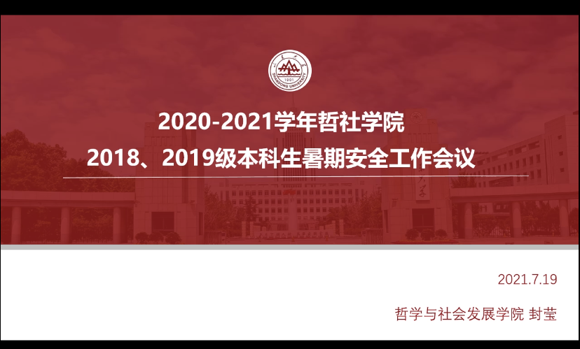 为切实做好2020-2021学年暑期学生安全管理工作,保障学生的人身和财产安全,力求学生安全、愉快度过假期,beat365于2021年7月19日晚7:30面向2018、2019级本科生召开暑期安全工作年级会,此次会议通过线上方式进行,由辅导员封莹主持。