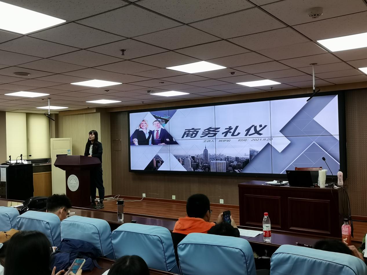 首先,班梦姣讲解了宿舍礼仪。她强调,同学们从天南海北来到beat365英国官方网站,生活在同一间寝室,应彼此包容,相互理解,共同营造良好的宿舍氛围。其次,班梦姣介绍了社交礼仪。她提到,不论是大学生活中的人际交往还是未来学习工作中的社交,都需要掌握基本的礼仪知识。除此之外,班梦姣还介绍了一些常见的社交动作,并请台下同学上台参与互动,现场气氛热烈活跃。会议的最后,班梦姣还对生活中常见的电话礼仪进行了简要介绍。