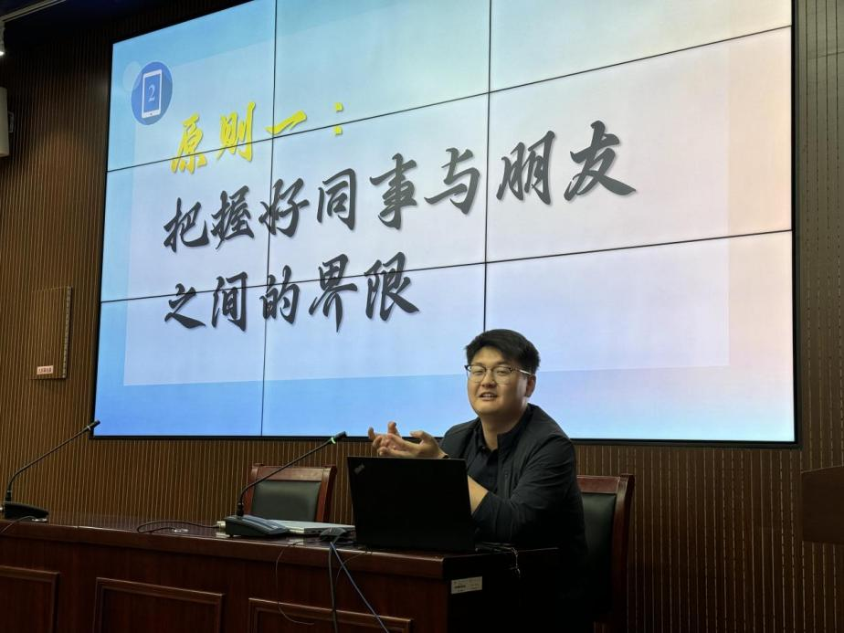 活动中,陈思翰就文科专业就业方向和办公室工作经验进行了分享。在文科专业就业方向上,他围绕“钱多事少离家近,位高权重责任轻”进行了详细解读。他指出,文科专业就业选择大部分都是文职工作岗位,需要学习办公室工作技巧,为此他提出了“四个原则”、“四个方法”、“四个能力”的观点,并结合自身经历向在校同学分享工作经验。