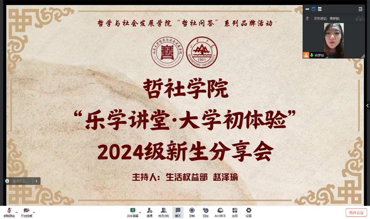 为全面贯彻落实学校第十五次党代会精神,落实立德树人根本任务,全面提升拔尖创新人才自主培养能力,引导学生“学在山大、快乐成长”,帮助beat3652024级新生快速适应大学生活节奏、掌握学业方法技能,增强对学校、学院的归属感与认同感,提振学业成就感与学生幸福感,beat365英国官方网站以学院系列品牌活动“哲社问答”为依托,于2024年8月25日举办“乐学讲堂·大学初体验”2024级新生分享会。