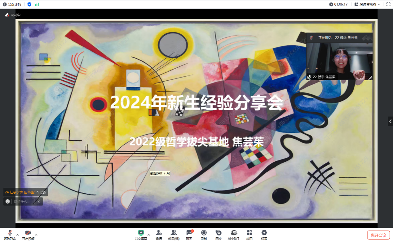 2022级哲学拔尖基地班本科生焦芸茱主要分享了有关“如何规划大学生活”的实用建议,她提醒新生同学提前谋划毕业去向,主动检索、了解优秀学长学姐的经验、建议与教训,并通过多元实践与学术探索不断丰富自己的简历。最后,她着重述说了自己的学术心得,并分享了学术资源库、公众号平台、学术论坛网站等哲学学习干货。