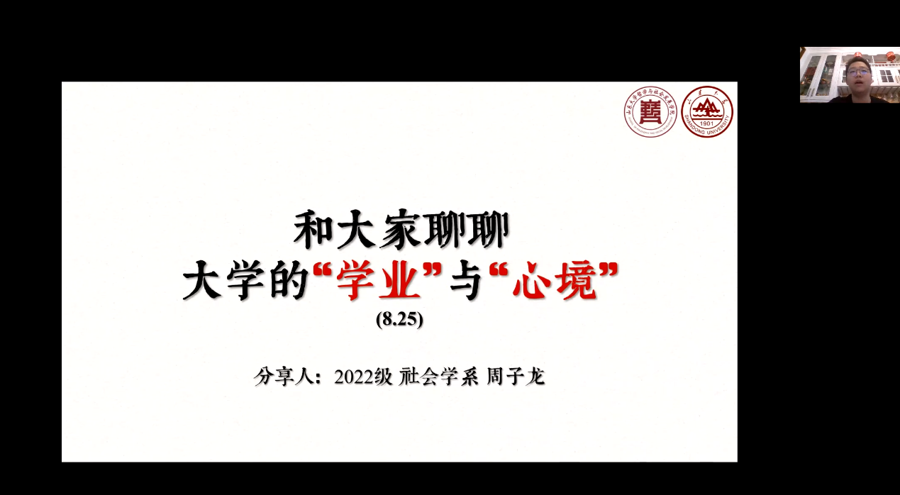2022级社会学系本科生周子龙则从“学业”与“心境”两个维度与新生展开对话交流。他在“学业”方面重点提到综测和体测等学院、学校新规范新政策的出台,并从“大一/大二之变”这一现象入手,介绍了随着年级升高,社会学系本科生课程设置、考核方式与学术训练目标的变化;在“心境”方面,他以“意义何在”发问,告诫同学们积极寻求自己所向往的志业和天职,用坚实、稳定的意义感来源,来抵抗自由而不确定的大学生活秩序。