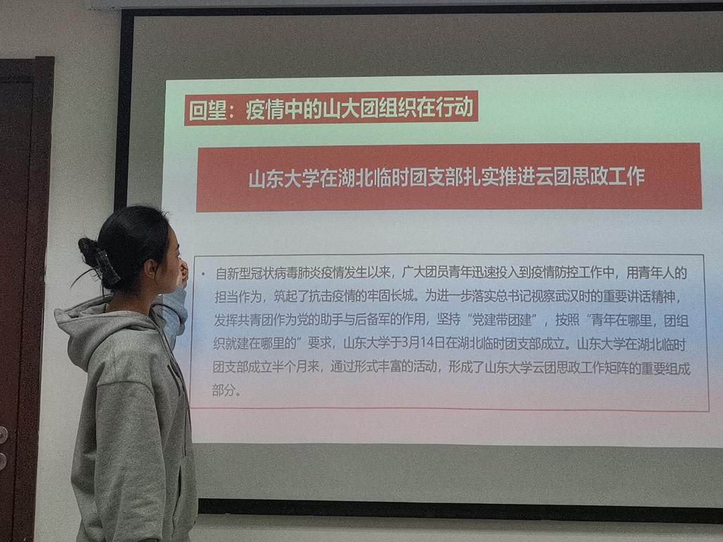 班会结束后,团支书屈雅楠主持团会。在会上,她声情并茂地讲解着共青团组织在抗疫过程中发挥的巨大作用,并回望了beat365英国官方网站团组织的积极行动,同学们认真聆听,加深着对团组织的了解。