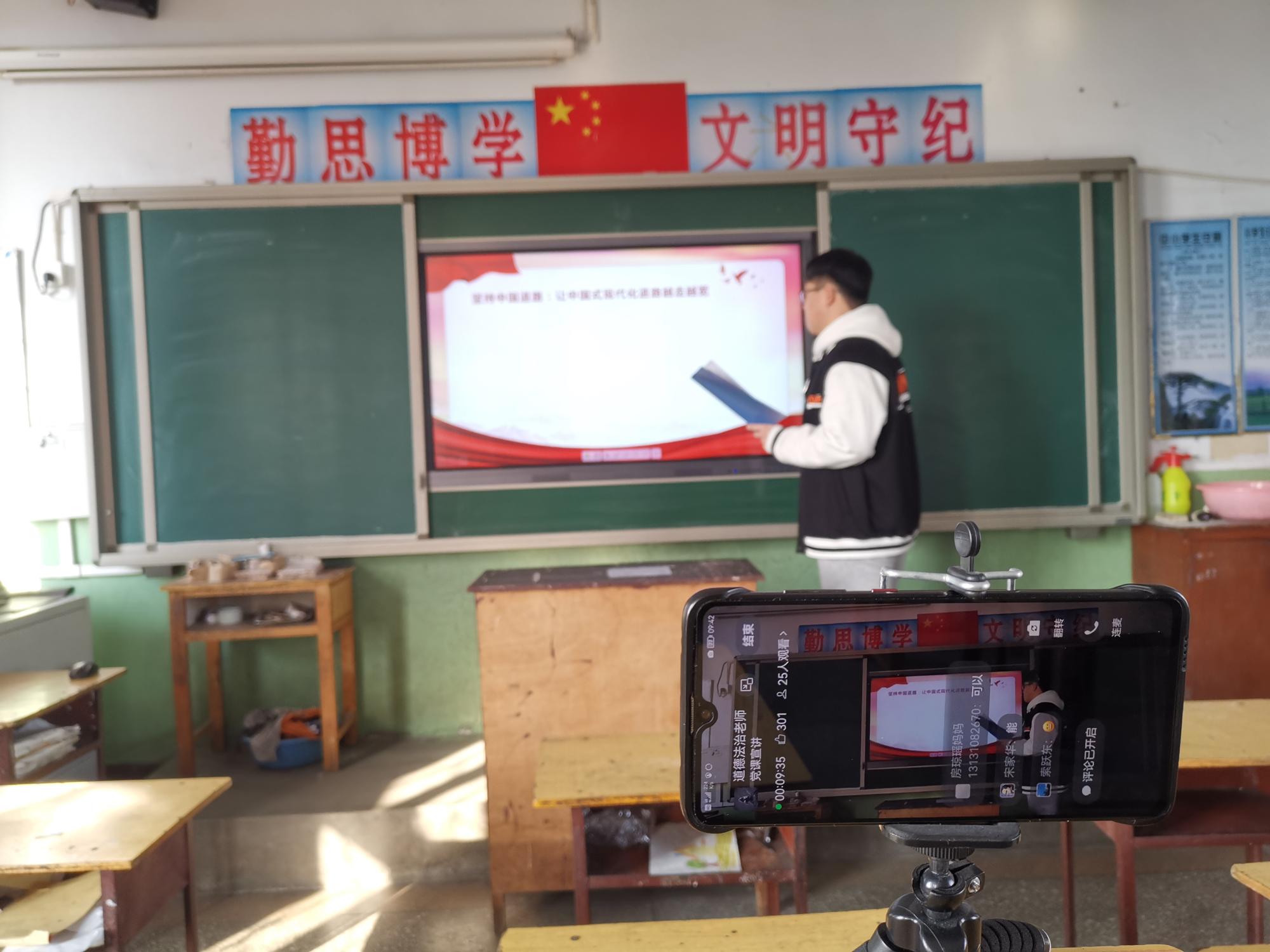 大峪小学位于河北省南部的峰峰矿区大峪镇,是一所普通的乡村小学。为适应疫情防控需要,此次活动采取线上线下相结合的形式开展,宣讲团成员郭昊天前往大峪小学,在教室中进行宣讲,同学们通过微信群直播线上观看。