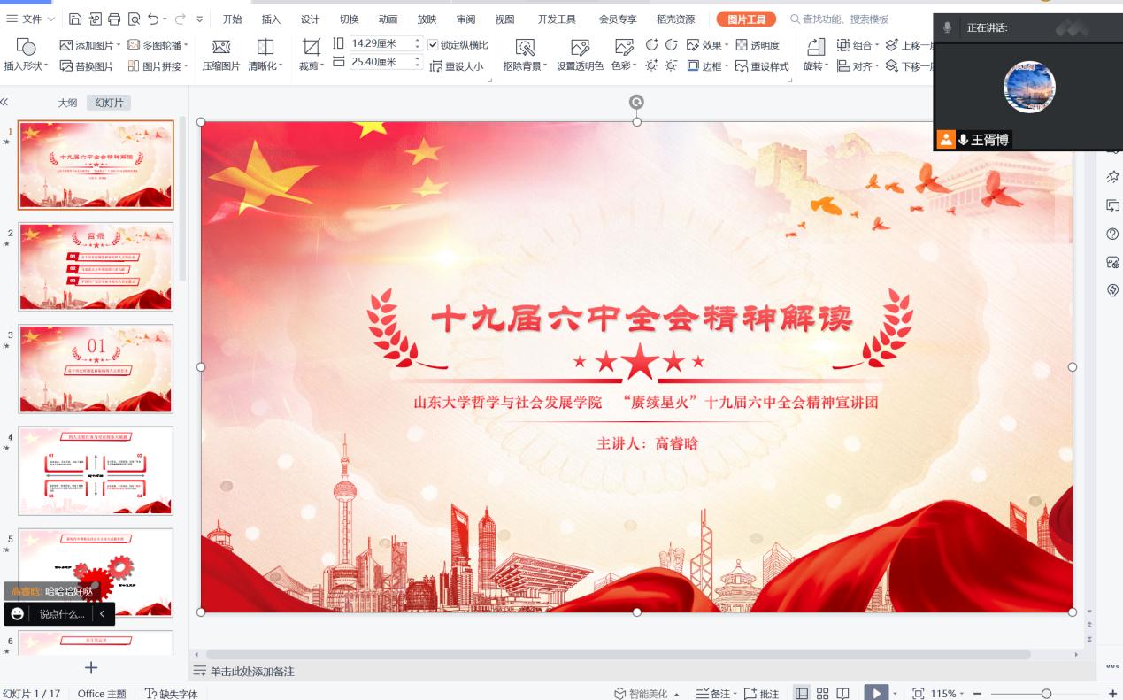 为积极宣传党的十九届六中全会精神,引领广大群众坚定不移听党话,跟党走,beat365英国官方网站beat365“赓续星火”十九届六中全会宣讲团赴临沂市宋家王庄社区进行宣讲,本次宣讲面向社区居民委员会成员,考虑到当地疫情防控政策要求,经宣讲团成员与社区负责人沟通协商,本次宣讲会采用线上宣讲的方式进行。