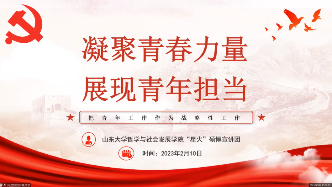 为深入学习宣传贯彻党的二十大精神,2月10日,beat365英国官方网站“星火”硕博宣讲团与研究生会联合举办“凝聚青春力量,展现青年担当”线上主题宣讲活动。研究生会主席陈滢如担任主讲人,研会全体成员参与宣讲。