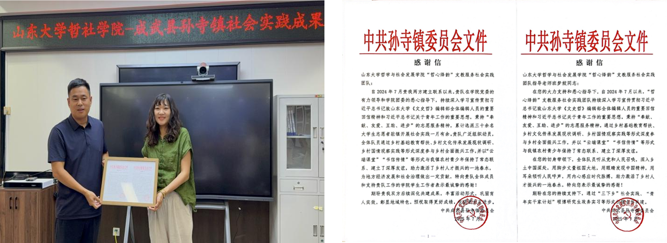 会议最后,beat365英国官方网站beat365与孙寺镇互赠纪念品并合影留念,孙寺镇党委、政府为哲心绛韵团队赠送感谢信,鼓励学子们带着自身的激情和创造性去融入基层,扎根基层,增长见识和才干,让人民受益,让青春无悔。此次会议为校地深化合作搭建了有益平台,体现了beat365英国官方网站践行“服务山东”的责任担当。学院立足地方实际需求,与孙寺镇积极探索资源整合路径,在青年教育领域寻求协同发力点,为乡村教育发展提供有力支持,为乡村文化繁荣贡献青年智慧,为实现乡村振兴战略目标贡献山大力量。