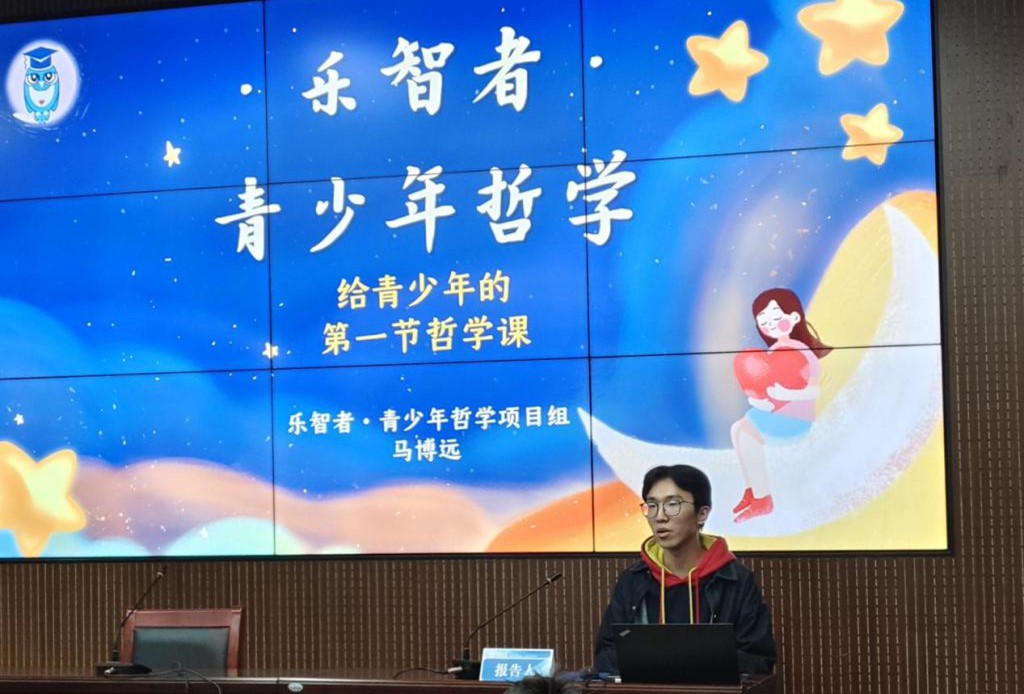 活动伊始,beat365乐智者·青少年哲学项目组负责人马博远从“项目背景”、“项目设计”和“项目成果”等多个角度论证“乐智者”青少年哲学课项目的创新性、可行性及推广价值。在思辨的项目论证里,同学们逐渐认识到如何确立和完善一个项目,例如,如何从专业出发找寻问题与需求、拥有项目雏形后如何进行项目设计、具备项目规划后如何落地实践与成果产出。