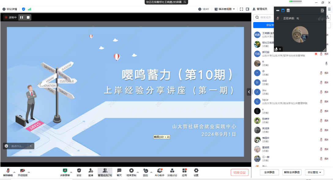 现就职于山东省某省直单位的潘学长利用思维导图分享了他备战选调生考试的经验。潘学长着重介绍了选岗报名的注意事项和准备笔试面试的方法。他指出,同学们要及时完善个人求职规划,明确未来发展目标,以积极、健康的态度迎接挑战。