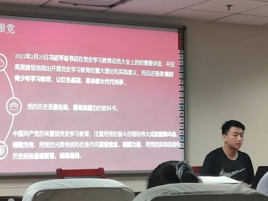 首先,同学们一起观看了党史短片,一同回忆建党那段艰难的岁月,艰难困苦,玉汝于成,通过观看党史短片,同学们了解到革命先辈们不畏艰险抛头颅、洒热血的澎湃激情,更加坚定了努力奋斗的决心。