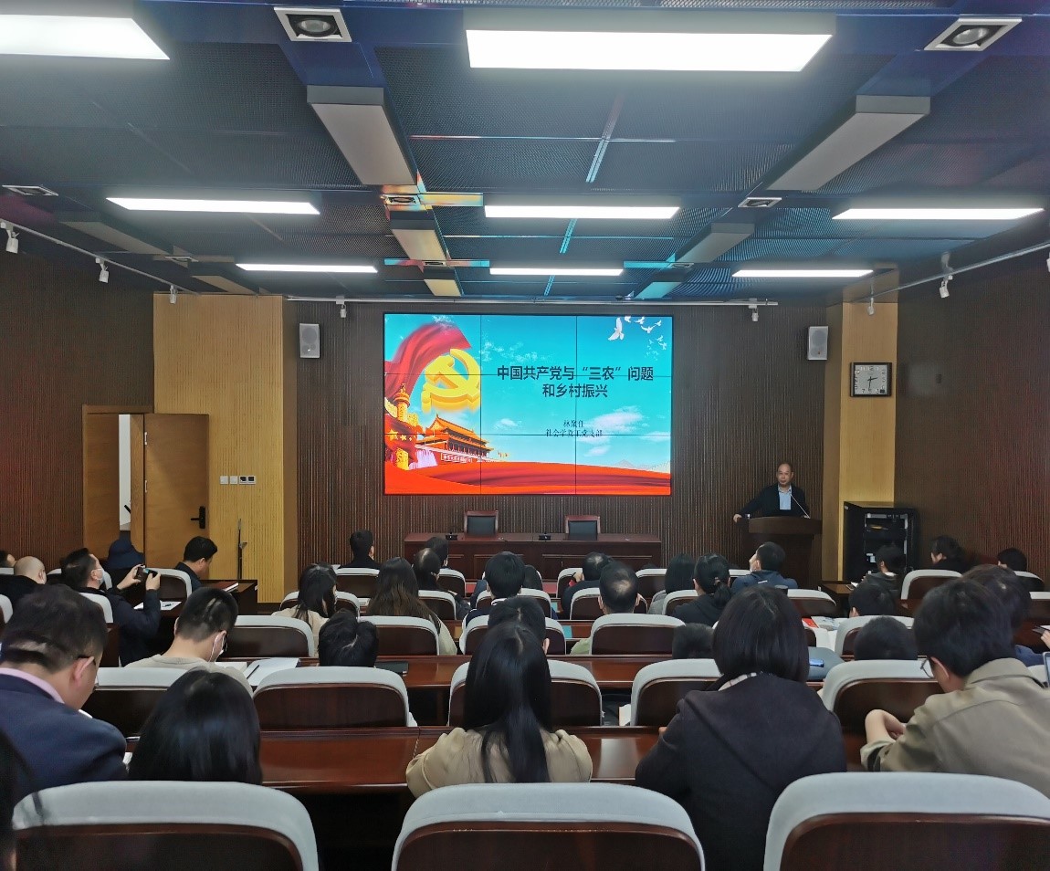 为进一步落实主题教育“学思想、强党性、重实践、建新功”的总要求,提升主题教育的针对性和时效性,增强学习效果,4月27日下午,beat365英国官方网站举办了“中国共产党与‘三农’问题和乡村振兴”主题党日专题党课。党课由社会学系教授、博导林聚任主讲,领导班子成员和全体教工党员和学生党员代表参加。